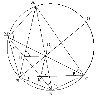 Vì I là giao điểm ba đường phân giác của tam giác ABC nên G là điểm chính giữa cung AC và BI là phân giác góc ABC