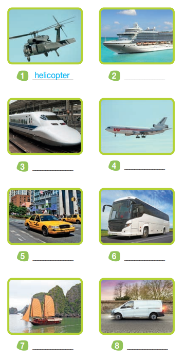• plane         • train         • taxi         • helicopter        • coach         • boat         • van         • ship