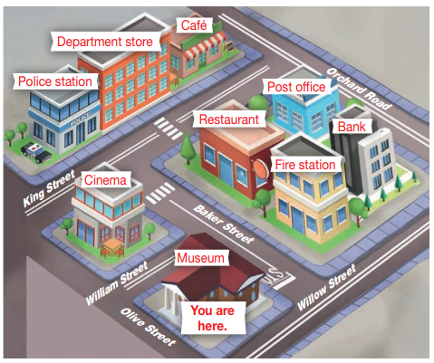 B: Of course. Go across William Street, go past the cinema and turn right. Walk along King Street. The department store is on the left, next to the police station.