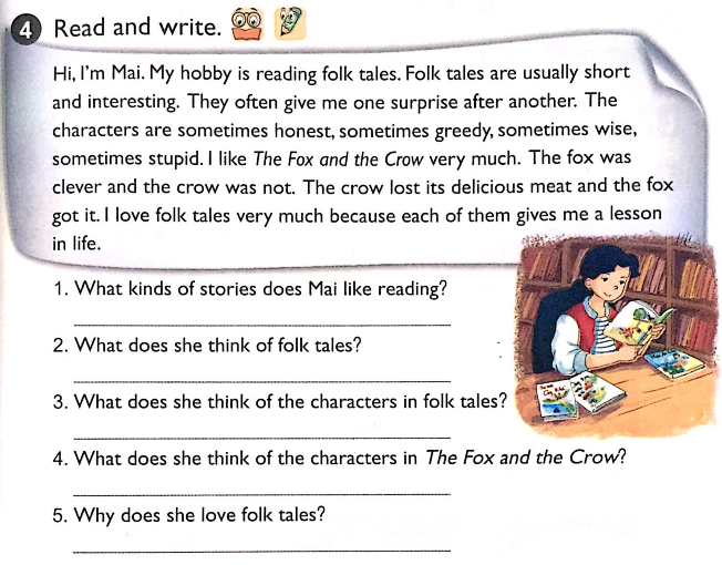 1. Những loại truyện Mai thích đọc là gì? She likes reading folk tales. Cô ấy thích đọc những truyện dân gian.