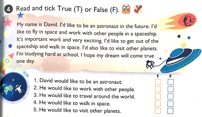 Tên mình là David. Mình muốn trở thành phi hành gia trong tương lai. Mình muốn bay vào không gian và làm việc với những người khác trong con tàu vũ trụ. Đó là công việc quan trọng và rất thú vị. Mình muốn đi ra khỏi tàu vũ trụ và đi bộ trong không gian. Mình cũng muốn ghé thăm những hành tinh khác. Mình đang học tập rất chăm chỉ ở trường. Mình hi vọng ước mơ của mình sẽ trở thành hiện thực vào một ngày nào đó.