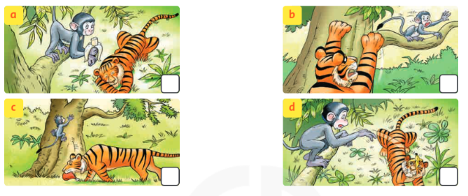 4 The tiger is watching the mokey. It wants to eat the monkey. The monkey is running.