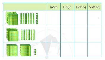 Quan sát hình, mỗi ô vuông lớn tương ứng với 100 hình lập phương nhỏ, mỗi cột có 10 hình lập phương nhỏ. Từ đó điền các số trăm, chục, đơn vị và viết số.