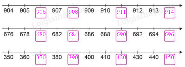 Quan sát các tia số, xác định khoảng cách giữa hai vạch chia là bao nhiêu đơn vị rồi viết tiếp vào ô trống.