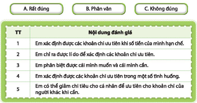 Chia sẻ về những thuận lợi và khó khăn khi thực hiện các hoạt động trong chủ đề này. Với mỗi nội dung đánh giá sau đây, hãy xác định một mức độ phù hợp nhất với em.