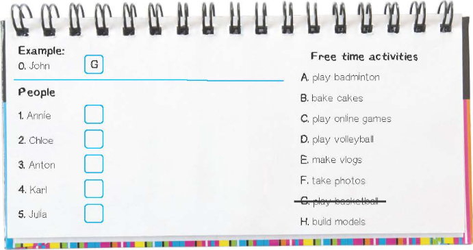 You will hear John talking to his mom about his friends’ free time activities. Which activity does each person do? For each question, write a letter (A-H) next to each person. You will hear the conversation twice.