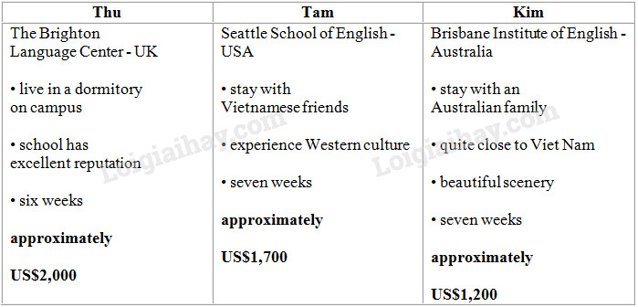 Work in groups. You are Thu, Tam and Kim.and you are awarded a scholarship of US$2,000 to attend an English language summer course abroad.