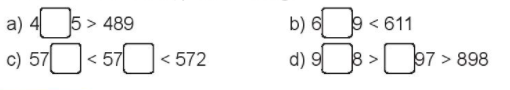 Nối (theo mẫu). a) Viết các số 796, 887, 769, 901 theo thứ tự từ bé đến lớn: ………………………………………………………………………………………………………….. Khoanh vào số lớn nhất trong các số sau: 534 589 499 515 Viết chữ số thích hợp vào ô trống: