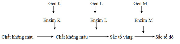 Các alen lặn đột biến k, l, m đều không tạo ra được các enzim K, L, M tương ứng. Khi các sắc tố không được hình thành thì hoa có màu trắng. Cho cây hoa đỏ đồng hợp tử về cả ba cặp gen giao phấn với cây hoa trắng đồng hợp tử về ba cặp gen lặn, thu được F1; Cho các cây F1 giao phấn với nhau, thu được F2. Biết rằng không xảy ra đột biến, theo lí thuyết , trong tổng số cây thu được ở F2, số cây hoa vàng chiếm tỉ lệ.