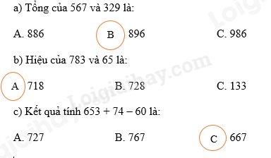 Khoanh vào chữ đặt trước câu trả lời đúng. a) Tổng của 567 và 329 là: A. 886 B. 896 C. 986 b) Hiệu của 783 và 65 là: A. 718 B. 728 C. 133 c) Kết quả tính 653 + 74 – 60 là: A. 727 B. 767 C. 667 Giải bài toán theo tóm tắt sau: Tóm tắt Nam cao: 121 cm Việt cao: 117 cm Nam cao hơn Việt: ….?