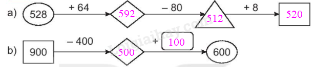 Thực hiện tính các phép tính theo chiều mũi tên rồi viết kết quả thích hợp vào ô trống.