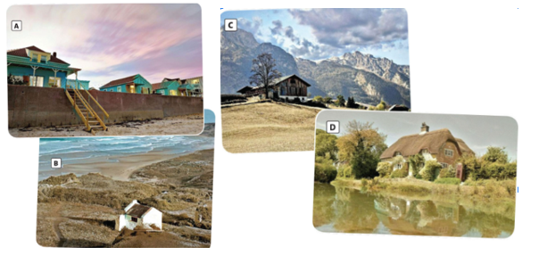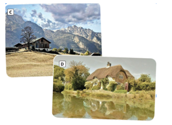 (Cả hai bức ảnh đều cho thấy những ngôi nhà. Ảnh C mô tả một ngôi nhà nhỏ, đơn giản nằm trên một ngọn đồi, có một cái cây ở tiền cảnh. Bầu trời nhiều mây, phía sau là những ngọn núi hùng vĩ. Ảnh D cho thấy một ngôi nhà nằm cạnh sông hoặc hồ, được bao bọc bởi cụm cây rậm rạp. Vị trí này toát lên bầu không khí yên bình và tách biệt, mang đến sự kết nối gần gũi hơn với các yếu tố tự nhiên.