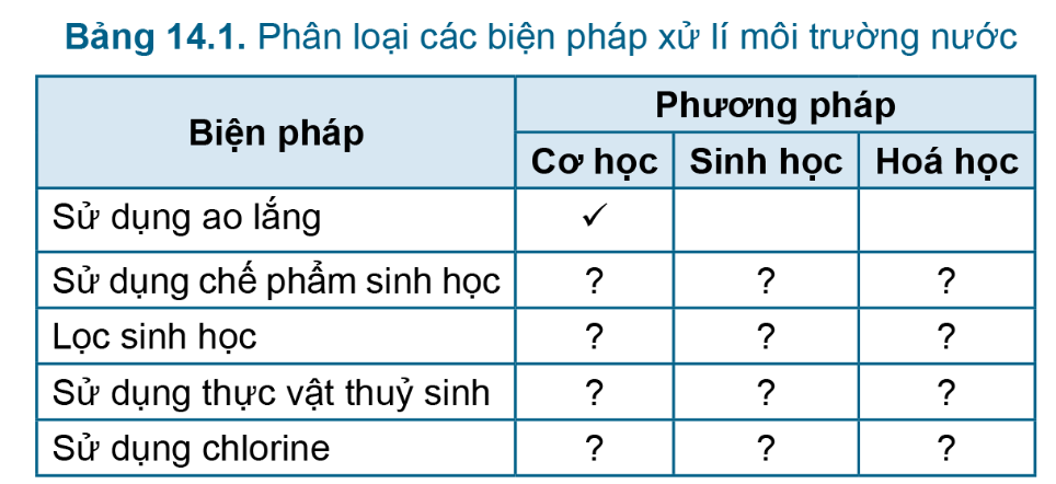 Em hãy phân loại các biện pháp xử lí môi trường nước theo mẫu Bảng 14.1.