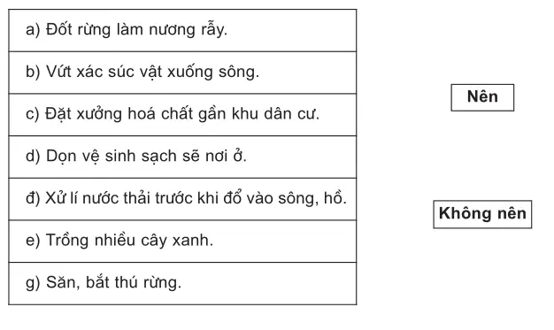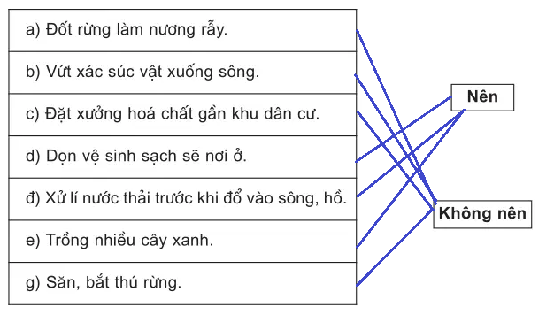 Em hãy nối các việc làm dưới đây với ô chữ “Nên” hoặc “Không nên” để góp phần bảo vệ môi trường.
