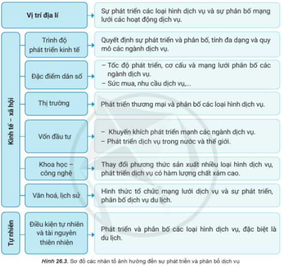 Đọc thông tin trong mục “Các nhân tố ảnh hưởng đến sự phát triển và phân bố các ngành dịch vụ” và quan sát hình 26.3.