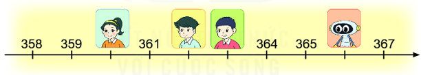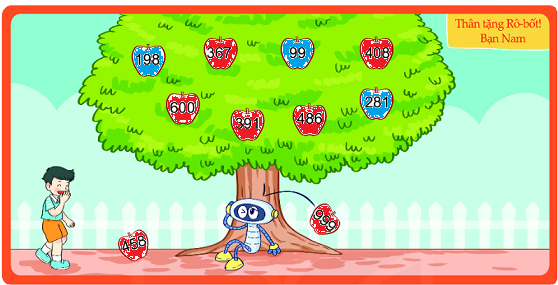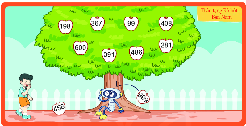 Rô-bốt muốn tô màu đỏ cho những quả táo ghi số lớn hơn 365 và tô màu xanh cho những quả táo ghi số bé hơn 365. Hỏi: