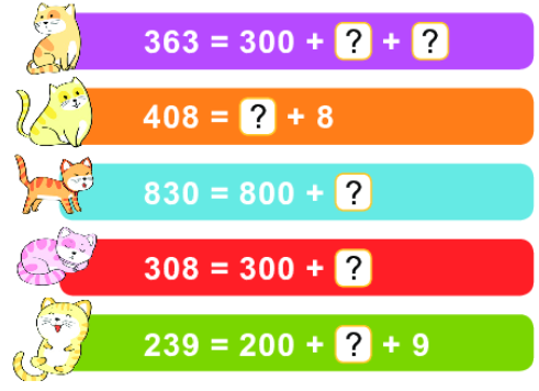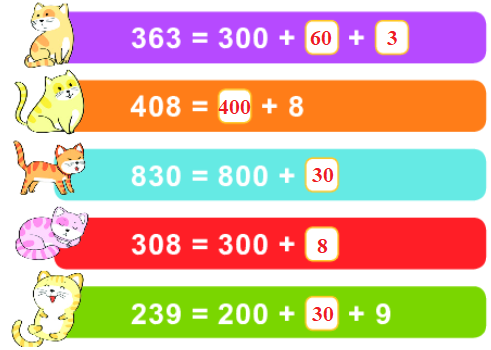 – Xác định số trăm, số chục, số đơn vị của mỗi số rồi viết số thành tổng các trăm, chục đơn vị.