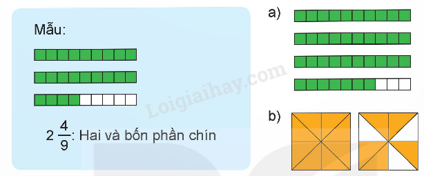 Viết và đọc hỗn số thích hợp với mỗi hình (theo mẫu).