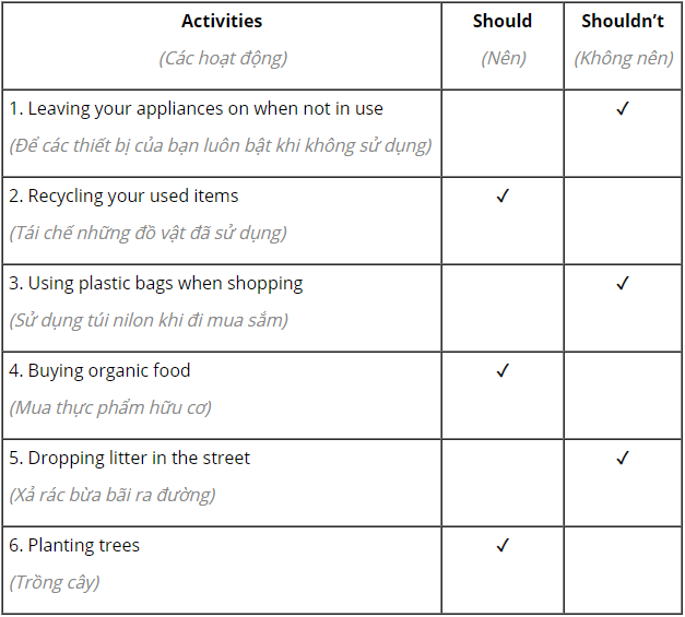 (Bạn nghĩ thanh thiếu niên nên hoặc không nên làm những hoạt động nào sau đây để sống xanh? Đánh dấu (✓) vào cột thích hợp.)