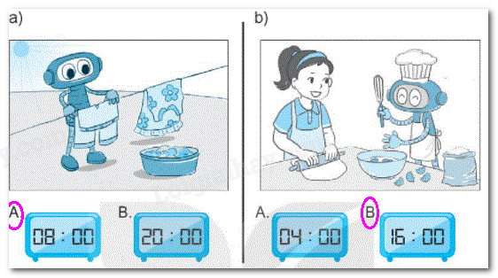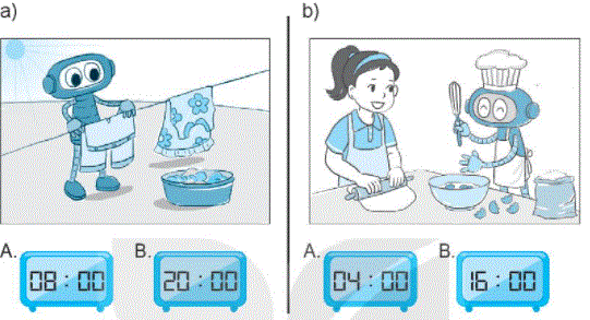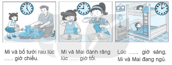 Khoanh vào chữ đặt trước đồng hồ chỉ thời gian thích hợp với mỗi bức tranh.