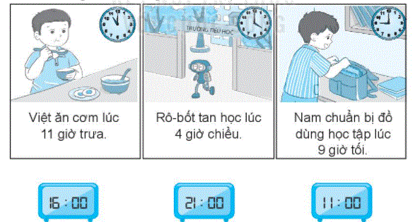 Quan sát tranh rồi nối với đồng hồ chỉ thời gian thích hợp.