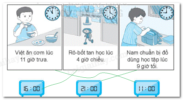 Nối đồng hồ chỉ thời gian thích hợp với mỗi bức tranh.