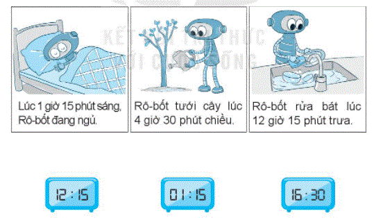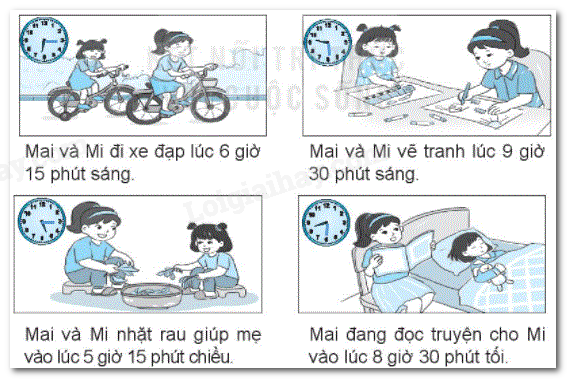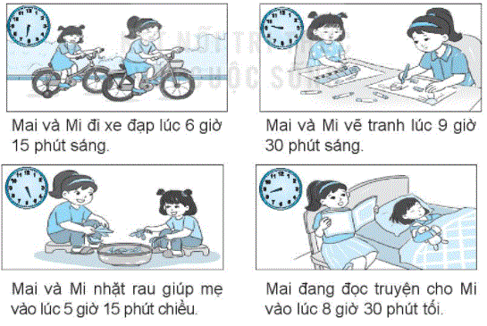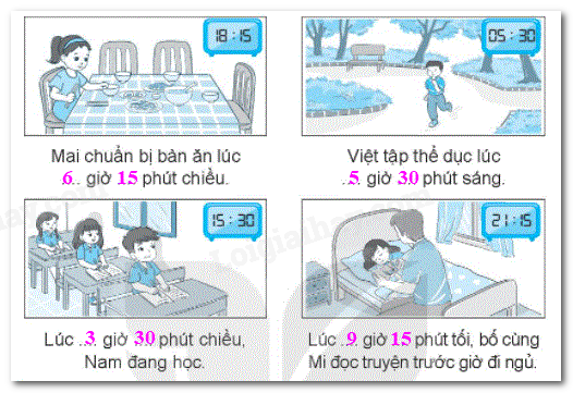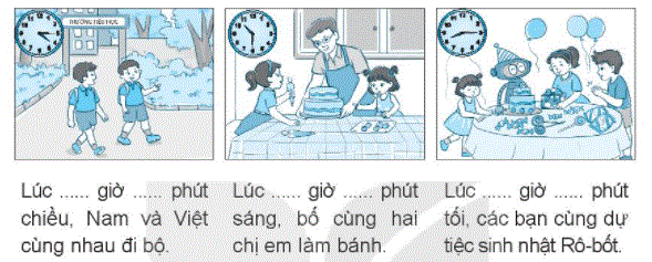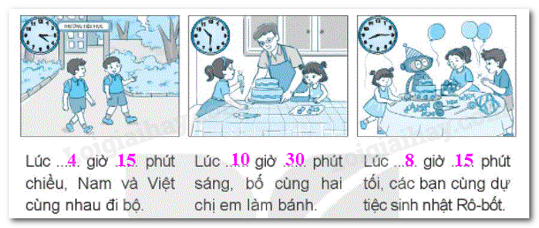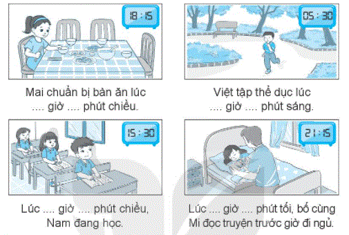 Quan sát đồng hồ trong mỗi tranh vẽ rồi điền thời gian thích hợp vào chỗ chấm.
