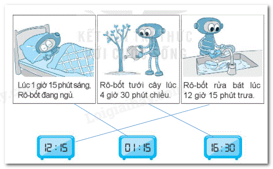 Quan sát tranh rồi nối với mỗi đồng hồ chỉ thời gian thích hợp.