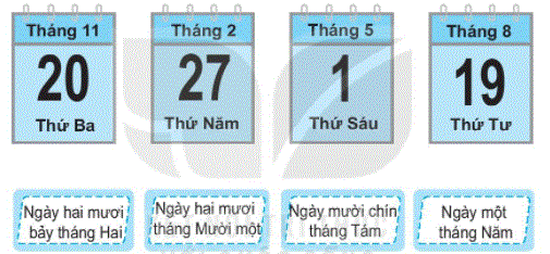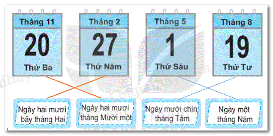 Quan sát ngày, tháng ghi trên mỗi tờ lịch rồi nối với cách đọc tương ứng.