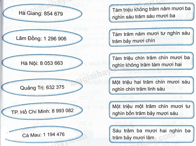 Nối số dân của mỗi tỉnh, thành phố với cách đọc số đóCho số 517 906 384. a) Các chữ số thuộc lớp triệu của số đó là …..