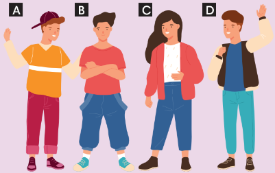 1. Look at the photos. Where are these girls? What are they doing? 2. Listen and read the conversation between two friends. Choose the best option for the following questions. 3. In pairs, tick (ü) the phrases from the dialogue in the Speaking box below. 4. Rearrange the sentences to make a meaningful dialogue between two teenager friends. The first sentence is given. 5. Work in pairs. Look at the pictures A, B, C, and D below. Ask each other for his / her opinion on clothes in each picture.