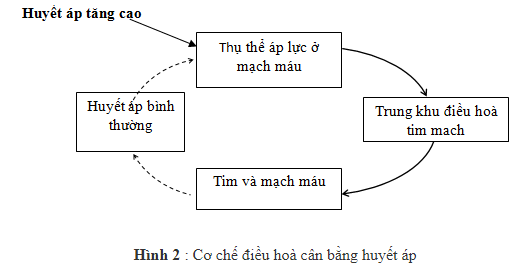 huyết áp tăng cao → trung khu điều hòa tim mạch ở hành não → thụ thể áp lực mạch máu → tim giảm nhịp và giảm lực co bóp, mạch máu dãn → huyết áp bình thường → thụ thể áp lực ở mạch máu