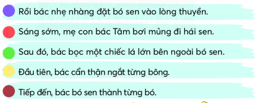 Em nhớ lại đoạn văn kể lại việc hai mẹ con bác Tâm hái sen rồi sắp xếp lại theo thứ tự hợp lí: đi mủng ra đầm sen -> hái sen -> bó sen thành từng bó -> bọc lá ngoài bó sen -> đặt vào lòng thuyền.