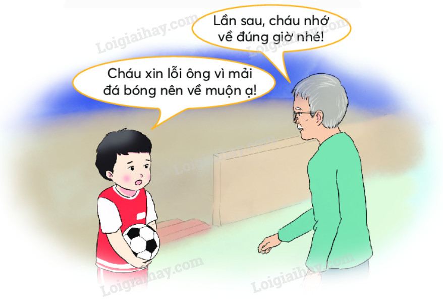 Cháu: Cháu xin lỗi ông vì mải đá bóng nên về muộn ạ!