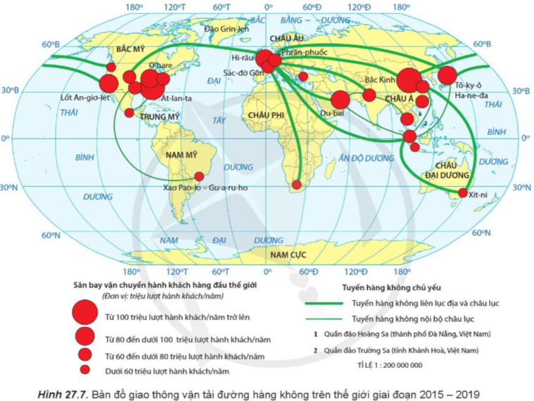Đọc thông tin và quan sát hình 27.7, hãy cho biết tình hình phát triển và phân bố của ngành giao thông vận tải hàng không trên thế giới.