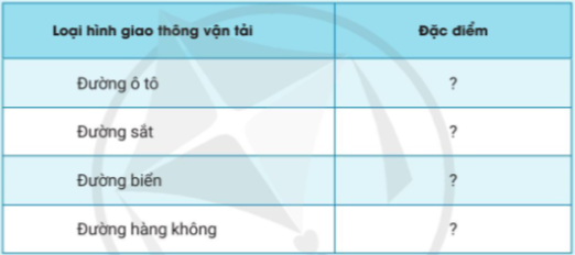 Hãy lập bảng theo mẫu sau để thấy được đặc điểm của các loại hình giao thông vận tải.