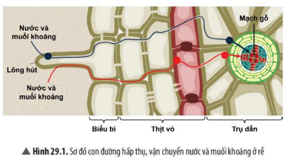 Câu 2: Quan sát Hình 29.1, em hãy mô tả con đường hấp thụ, vận chuyển nước và muối khoáng từ môi trường đất vào mạch gỗ của rễ.