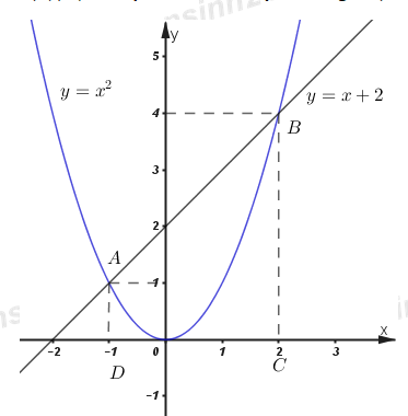 b) Tìm tọa độ giao điểm \(A,\;B\) của đồ thị hàm số \(y = {x^2}\) và \(y = x + 2.\) Gọi \(D,\;C\) lần lượt là hình chiếu vuông góc của \(A,\;B\) lên trục hoành. Tính diện tích tứ giác \(ABCD.\)