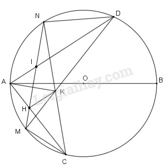 Cho đường tròn đường kính AB, các điểm C, D nằm trên đường tròn đó sao cho C, D nằm khác phía đối với đường thẳng AB, đồng thời AD > AC. Gọi điểm chính giữa của các cung nhỏ AC và AD lần lượt là M, N; giao điểm của MN với AC, AD lần lượt là H, I; giao điểm của MD và CN là K.