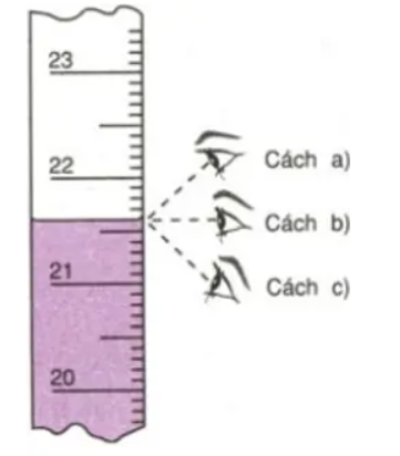 Cách đặt mắt để đọc thể tích chất lỏng là: Đặt mắt nhìn ngang với độ cao mực chất lỏng trong bình.