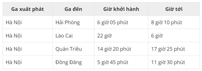 Bạn Lan xem giờ tàu từ ga Hà Nội đi một số nơi như sau: