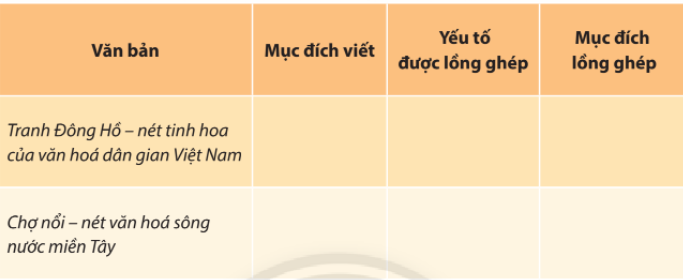 Xác định mục đích viết và mục đích lồng ghép các yếu tố miêu tả, tự sự, biểu cảm (và nghị luận nếu có) vào văn bản thông tin theo mẫu dưới đây (làm vào vở):