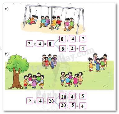 Nêu phép nhân và phép chia thích hợp với mỗi tranh vẽ: