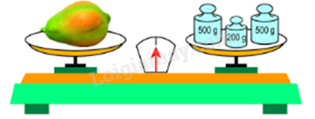 Do cân thăng bằng nên cân nặng của quả đu đủ bằng tổng cân nặng của các quả cân trên đĩa bên phải.