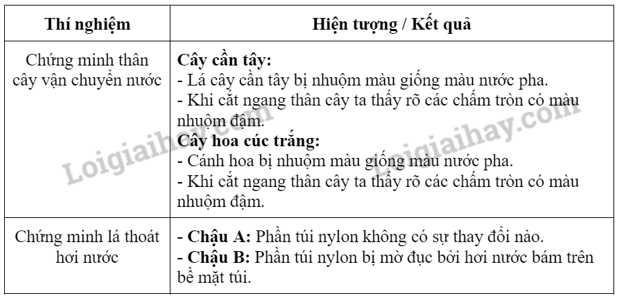 Hoàn thành bảng ghi kết quả thí nghiệm chứng minh thân vận chuyển nước và lá thoát hơi nước.