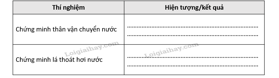 Hoàn thành bảng ghi kết quả thí nghiệm chứng minh thân vận chuyển nước và lá thoát hơi nước.