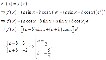 \(f\left( x \right) = \left( {3\sin x – 2\cos x} \right){e^x}\) thì giá trị \(a + b\) là: