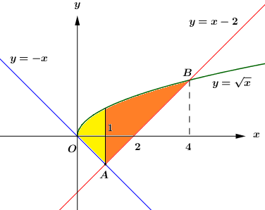 – \({S_2}\): Diện tích hình phẳng giới hạn bởi đồ thị hàm số \(y = \sqrt x ,\,\,y = x – 2\), \(x = 1,\,\,x = 4\).