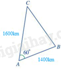 Ta có: \(AB = 2.700 = 1\;400\left( {km} \right),AC = 2.800 = 1\;600\left( {km} \right)\), \(\widehat A = {60^0}\)