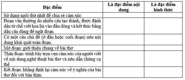 Trong bảng sau những đặc điểm nào thuộc về nội dung, đặc điểm nào thuộc về hình thức của đoạn văn ghi lại cảm xúc về một bài thơ lục bát (kẻ vào vở):